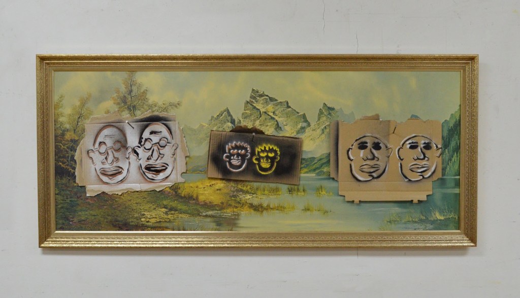 spray paint, cardboard, nails, and found print